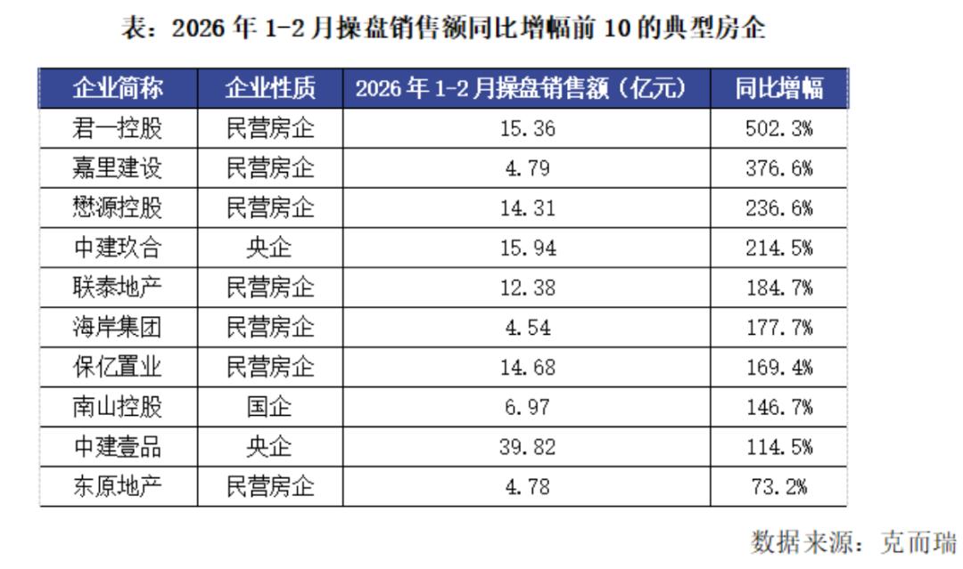 其中,民營房企君一控股前兩個月累計銷售操盤金額為15.36億元,同比大幅增長502.3%,同為民營企業(yè)的嘉里建設(shè)和懋源控股,也都實現(xiàn)了翻倍及以上的增長,同比增幅分別達到376.6%、236.6%。