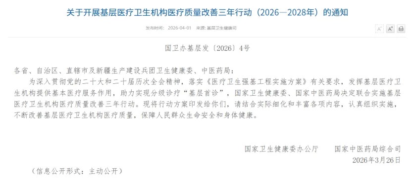 國家衛(wèi)生健康委員會聯(lián)合國家中醫(yī)藥管理局正式推出重要政策文件——《基層醫(yī)療衛(wèi)生機(jī)構(gòu)醫(yī)療質(zhì)量改善三年行動(dòng)方案(2026-2028年)》,該方案的落地實(shí)施將全面推動(dòng)基層醫(yī)療質(zhì)量提升。