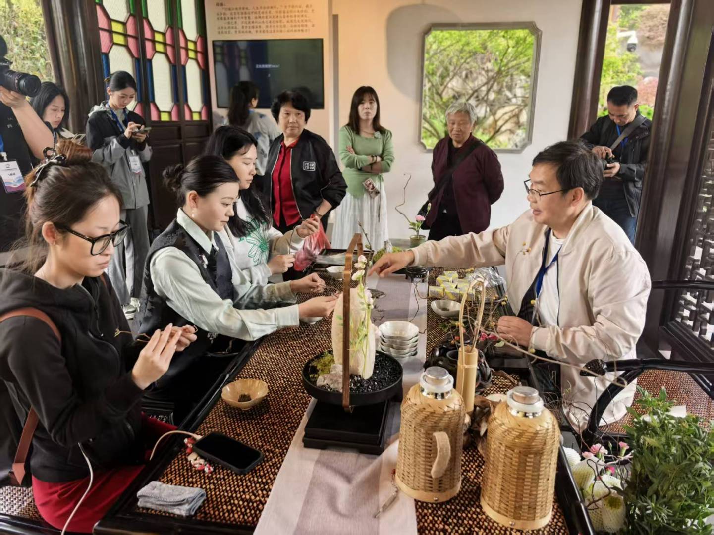 不遠處的花藝體驗區(qū)同樣人氣高漲,專業(yè)花藝師現(xiàn)場展示江南傳統(tǒng)插花技藝,以竹、石、鮮花為創(chuàng)作題材,將園林意境與花藝美學相融合,作品精巧別致、意蘊悠長,不少游客近距離觀賞,領略傳統(tǒng)花藝與江南園林的匠心巧思。