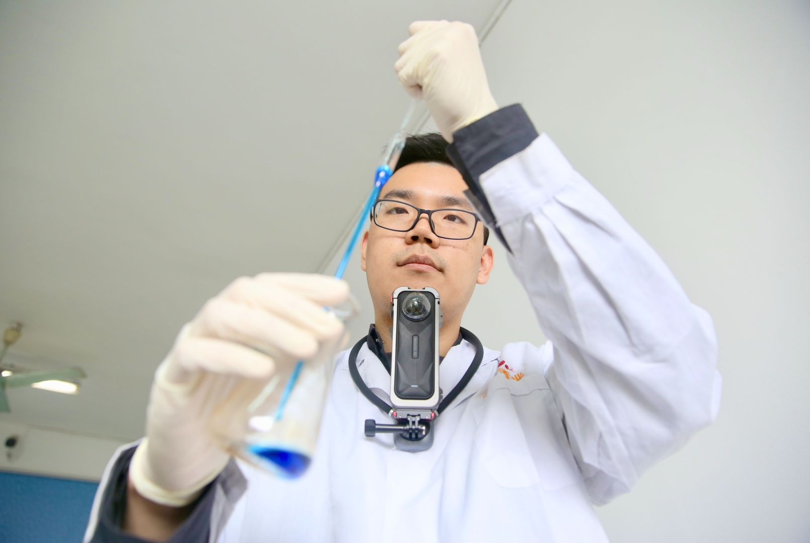 ▲曹立豐在實驗室做檢測,用運動相機記錄工作狀態(tài)。他還有一個身份是自媒體博主。