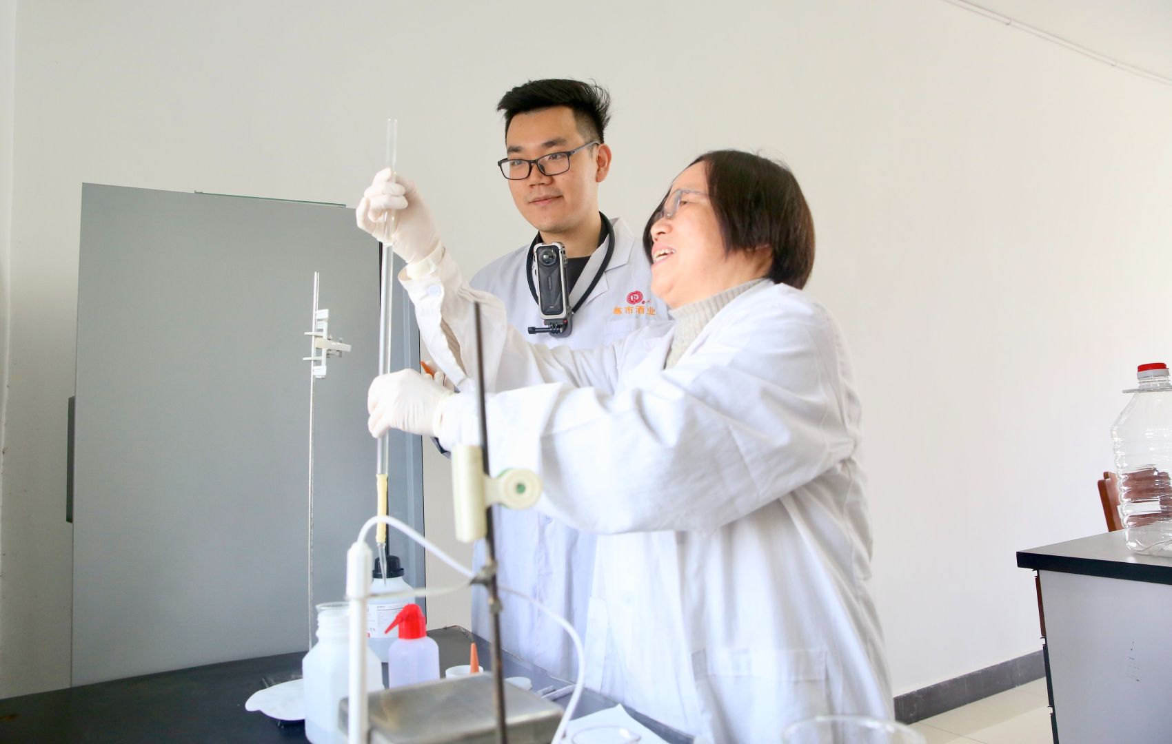 ▲在老師的指導下,曹立豐要完成黃酒的酒精度、甜度、酸度、pH值等檢測,過程復雜且需要耐心。