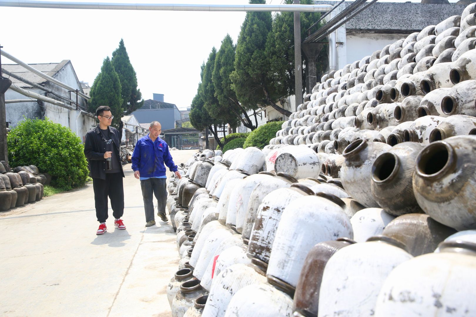 ▲曹立豐在黃酒廠露天曬場,一排排整齊碼放的老酒壇旁,與一線員工交流傳統(tǒng)黃酒釀造技藝。
