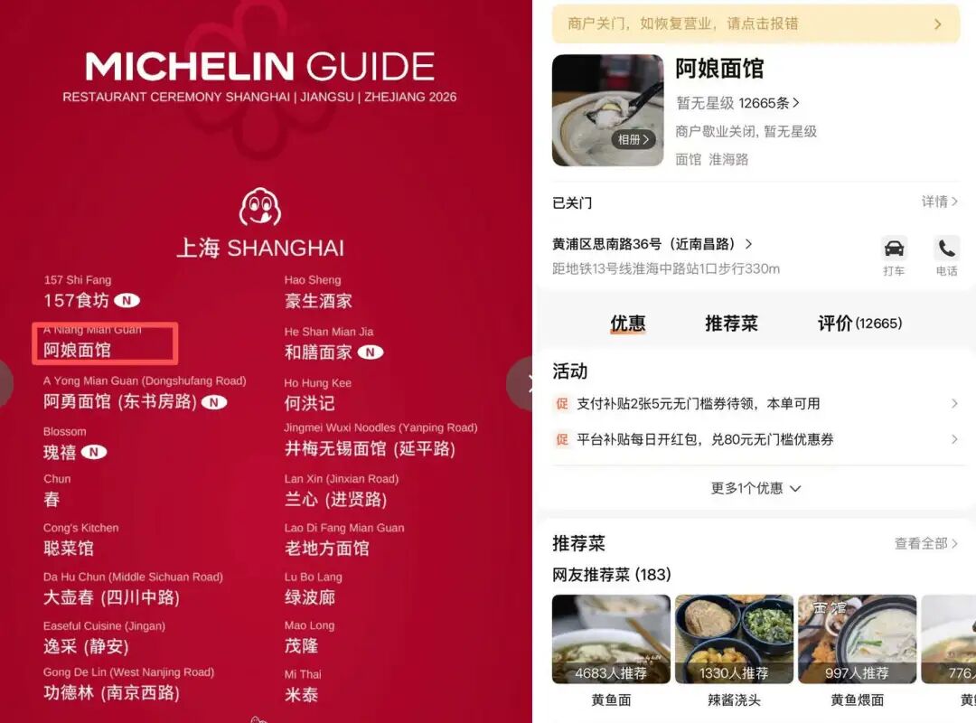 4月上旬,上海思南路的阿娘面館悄然關(guān)張。大眾點(diǎn)評(píng)頁(yè)面上的“商戶關(guān)門(mén)”標(biāo)簽,為這家運(yùn)營(yíng)三十余年的面館畫(huà)上句號(hào)。不久前發(fā)布的滬蘇浙米其林指南中,它仍在必比登推薦榜單,多年上榜的榮譽(yù)未能阻止其終結(jié)的命運(yùn)。