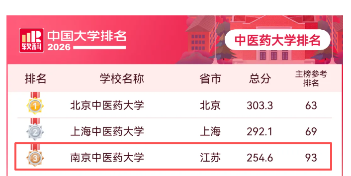 中醫(yī)藥大學(xué)排名中,南京中醫(yī)藥大學(xué)沖進(jìn)全國第3名。