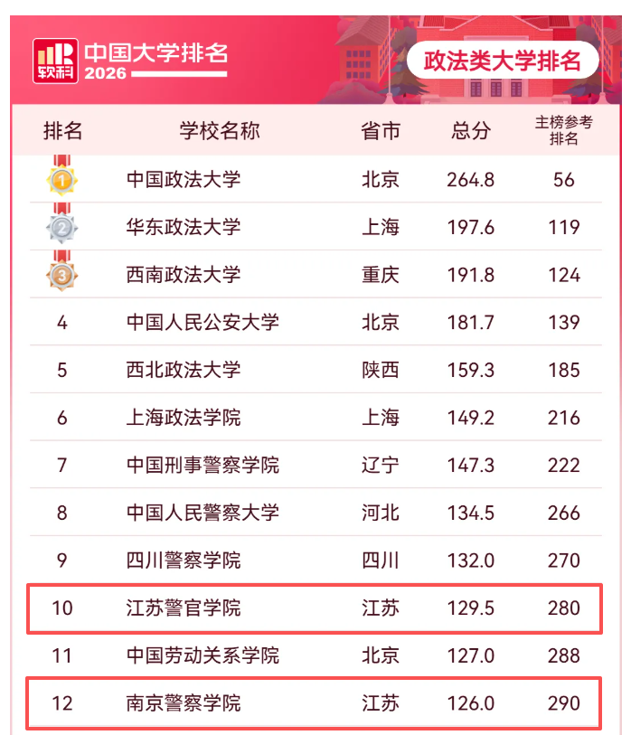 政法類大學(xué)排名里,江蘇警官學(xué)院排在第10位,南京警察學(xué)院位居第12位。