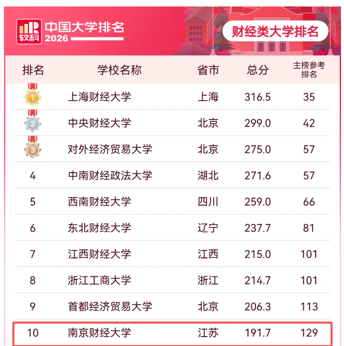 財(cái)經(jīng)類大學(xué)排名中,南京財(cái)經(jīng)大學(xué)位列第10位。