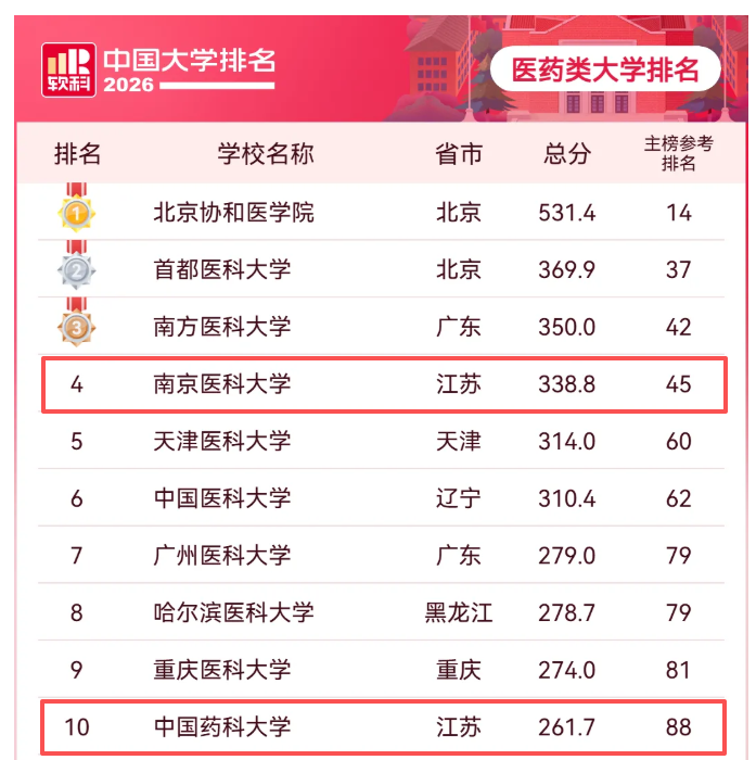 在分類排名中,江蘇高校同樣表現(xiàn)出色。醫(yī)藥類大學(xué)排名里,南京醫(yī)科大學(xué)位居第4位,中國藥科大學(xué)排名第10位。