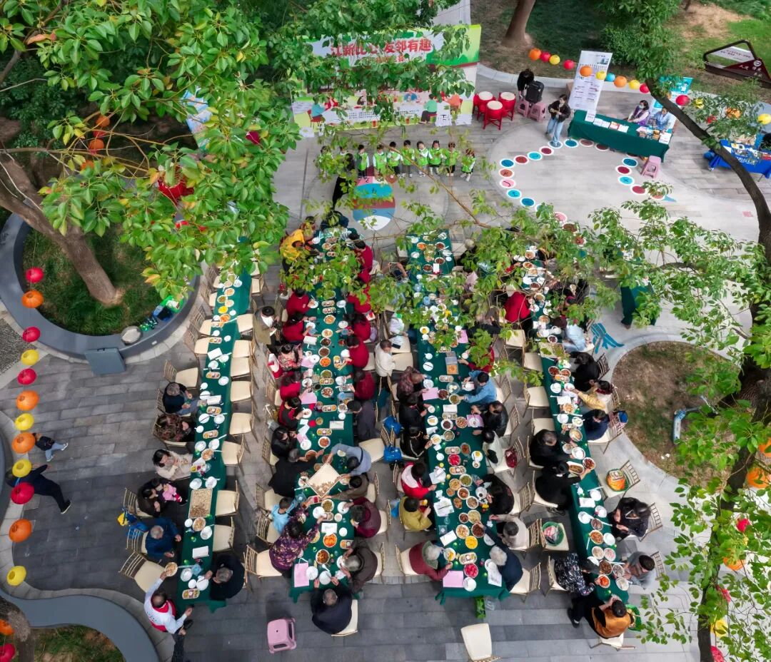 江新社區(qū)曾是典型的無物業(yè)開放式小區(qū):樓道雜物堆積、車輛亂停、鄰里交集甚少。2021年9月,社區(qū)組織發(fā)動下,永富網(wǎng)格284戶居民推選成立全市首個“小區(qū)鄰里互助會”。樓道建起微信聯(lián)系群,老人需要幫忙群里喊一聲,水管漏水鄰居主動上門。小區(qū)還自發(fā)制定《住戶守則》《車輛停放公約》《樓道保潔值日制度》。最受歡迎的是連續(xù)五年舉辦的“百家宴”,每家端出拿手菜,長桌從樓道口擺到廣場,“門對門不相識”的鄰居舉杯歡笑,成了“一家人”。