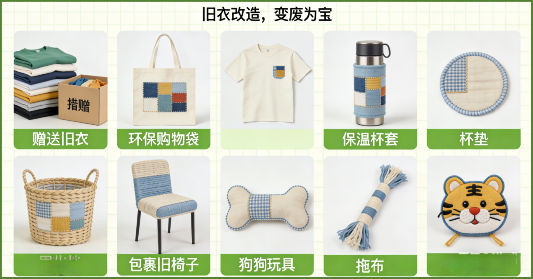 舊衣改造:減少紡織垃圾的填埋與焚燒,降低印染行業(yè)的水污染與碳排放。