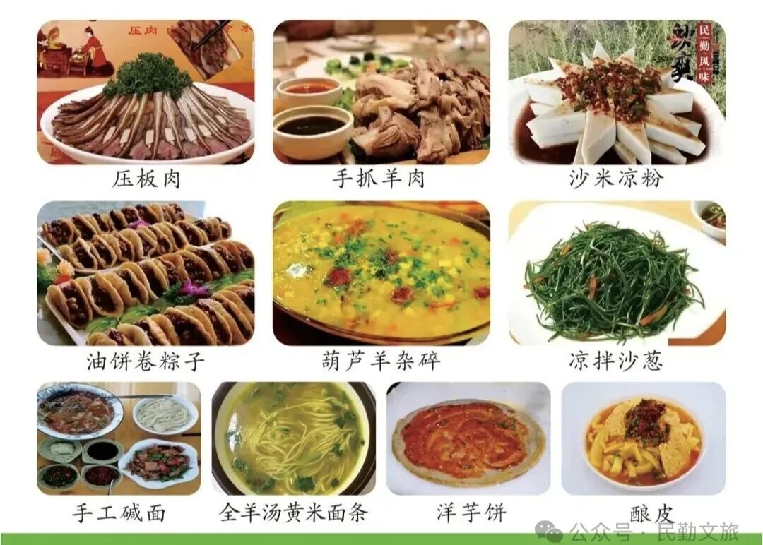 堿面茄辣燴、麥索、洋芋餅、沙米涼粉、黃米稠飯、薄荷(鎖陽)油餅、糖油糕、胡麻鹽卷卷、結(jié)子饃饃、油餅卷糕、涼拌沙蔥