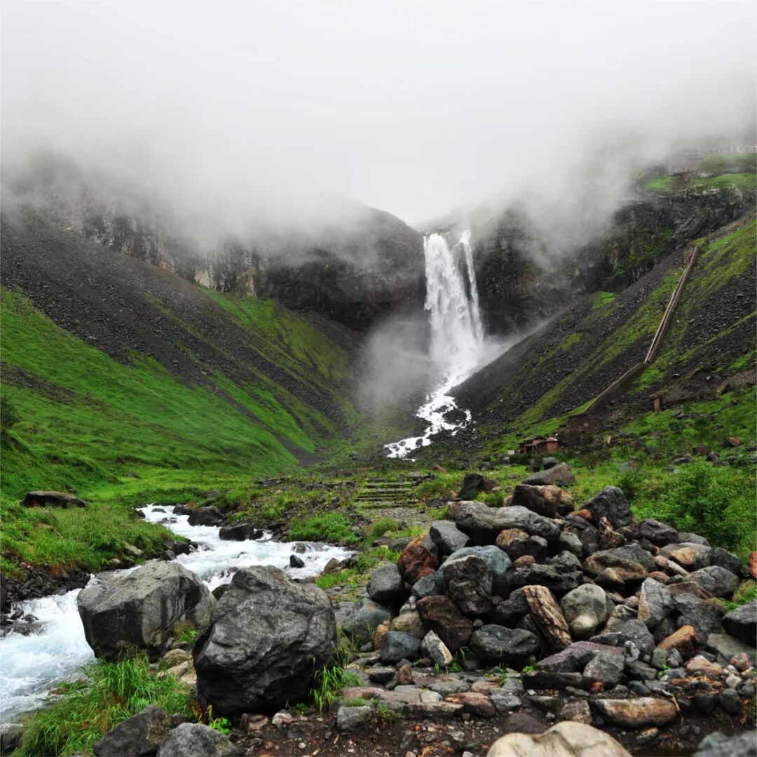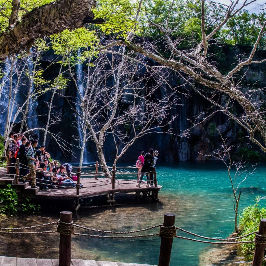 綠淵潭因池水碧綠深邃得名,瀑布飛流直下,最高落差26米,瀑水砸在巨石上四散,再匯入深潭。