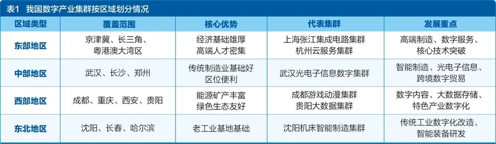 基于我國(guó)不同區(qū)域在經(jīng)濟(jì)基礎(chǔ)、資源稟賦與產(chǎn)業(yè)發(fā)展基礎(chǔ)上的顯著異質(zhì)性,數(shù)字產(chǎn)業(yè)集群的培育與發(fā)展呈現(xiàn)出鮮明的區(qū)域適配性特征,其布局邏輯、核心優(yōu)勢(shì)及發(fā)展方向均與區(qū)域特色深度綁定(如表1所示)。為系統(tǒng)厘清我國(guó)數(shù)字產(chǎn)業(yè)集群的區(qū)域分布格局與差異化發(fā)展路徑,本文以“區(qū)域類(lèi)型”為核心劃分標(biāo)準(zhǔn),從覆蓋范圍、核心優(yōu)勢(shì)、代表集群及發(fā)展重點(diǎn)四個(gè)維度,對(duì)東部沿海、中部、西部及東北地區(qū)的數(shù)字產(chǎn)業(yè)集群發(fā)展現(xiàn)狀進(jìn)行梳理,直觀呈現(xiàn)各區(qū)域依托自身比較優(yōu)勢(shì)培育產(chǎn)業(yè)集群的實(shí)踐路徑。