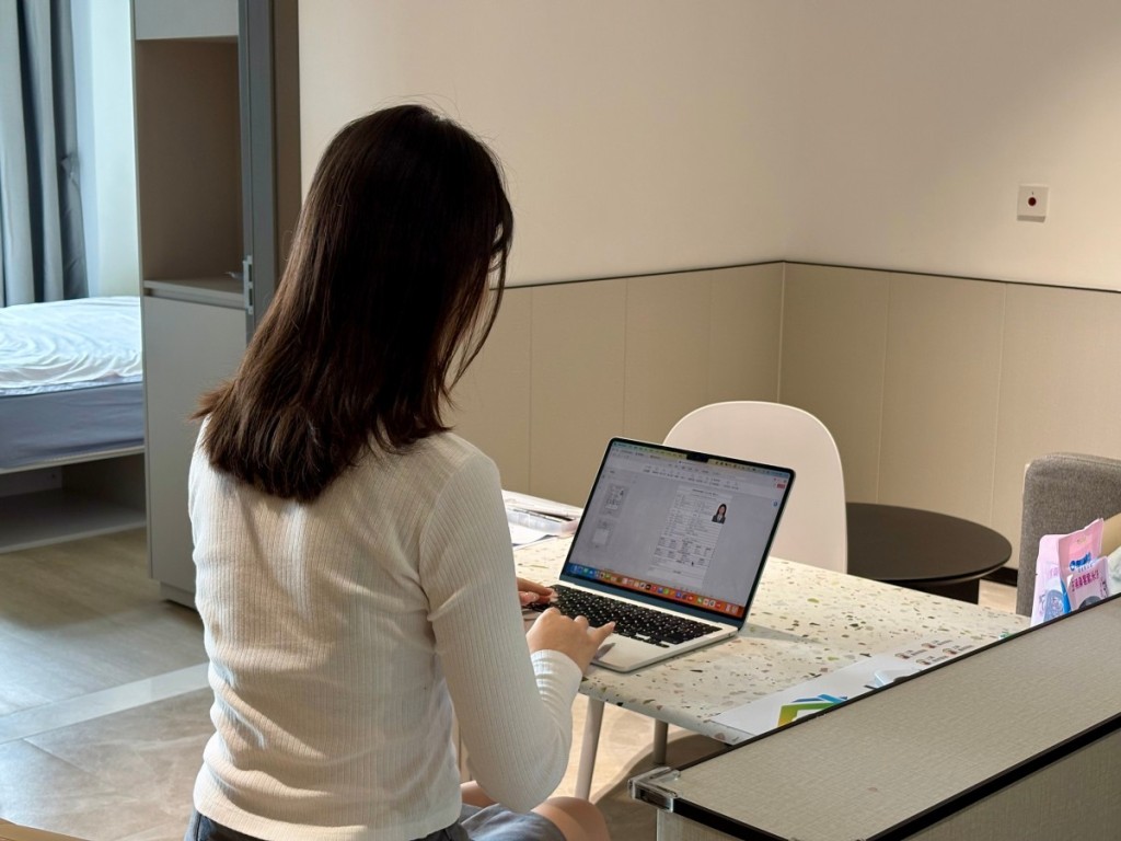 在長寧區(qū)虹橋人才公寓,李佳寧正在修改簡歷。澎湃新聞記者 陳悅 圖