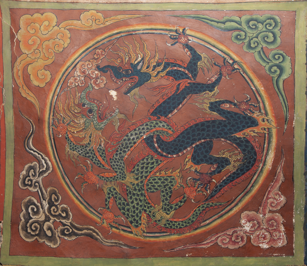 雙龍纏繞紋 明 藻井壁畫 龍軀分別為青綠色和深綠色 黃鬃毛成縷飄散 相互纏繞,龍頭隔云紋相對,發(fā)部向上飄揚(yáng),肘毛、背脊的鰭均呈火焰狀。采集于西藏阿里札達(dá)縣帕爾宗石窟。范久輝供圖
