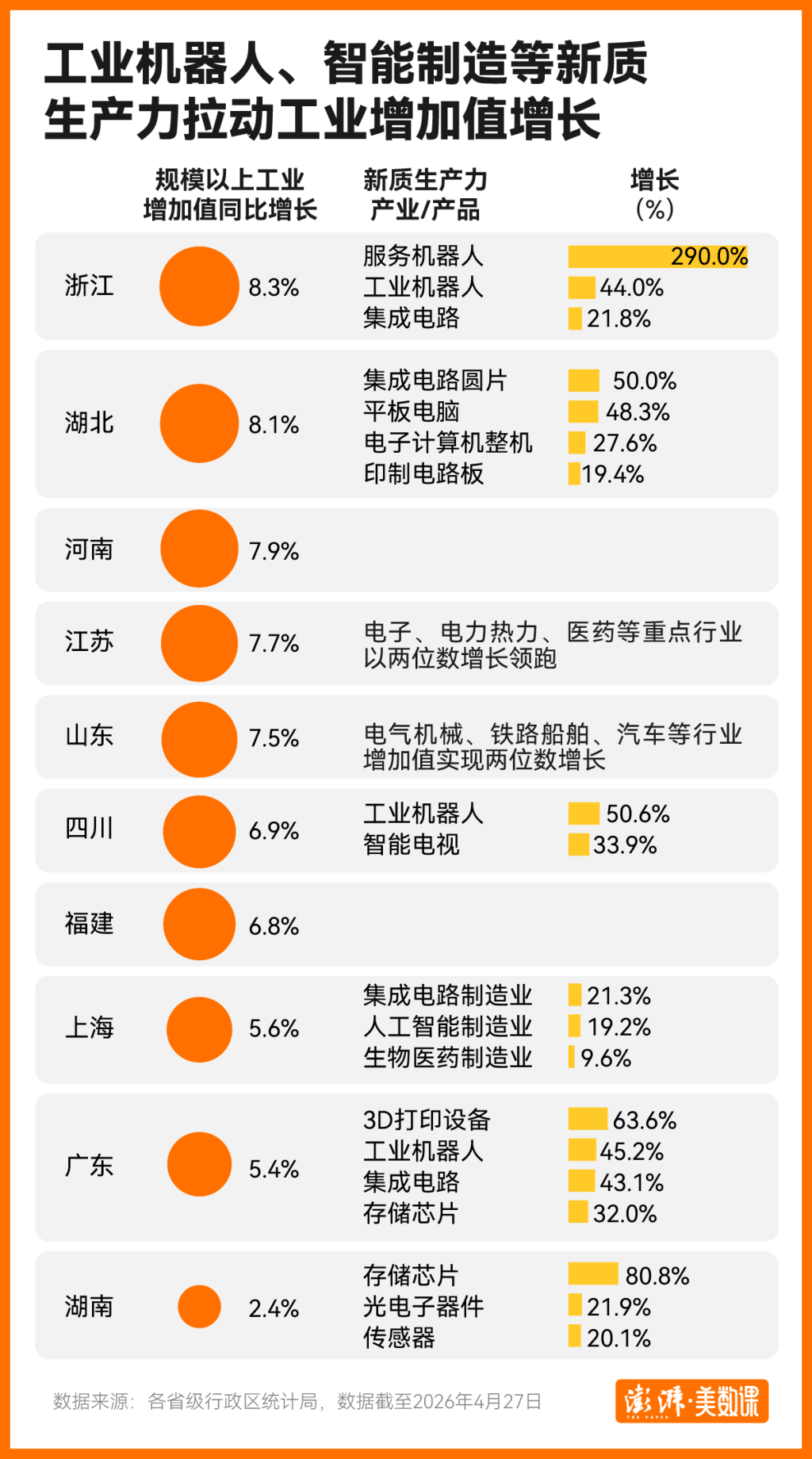 工業(yè)是經(jīng)濟大省發(fā)展的“壓艙石”。一季度,經(jīng)濟大省工業(yè)表現(xiàn)亮眼,7個省份的規(guī)模以上工業(yè)增加值增速高于全國6.1%的平均水平。其中,新質(zhì)生產(chǎn)力相關(guān)產(chǎn)業(yè)增速尤為迅猛,多數(shù)保持兩位數(shù)增長。例如,浙江服務(wù)機器人產(chǎn)量增長2.9倍,廣東3D打印設(shè)備產(chǎn)量增長63.6%,湖南存儲芯片產(chǎn)量增長80.8%。