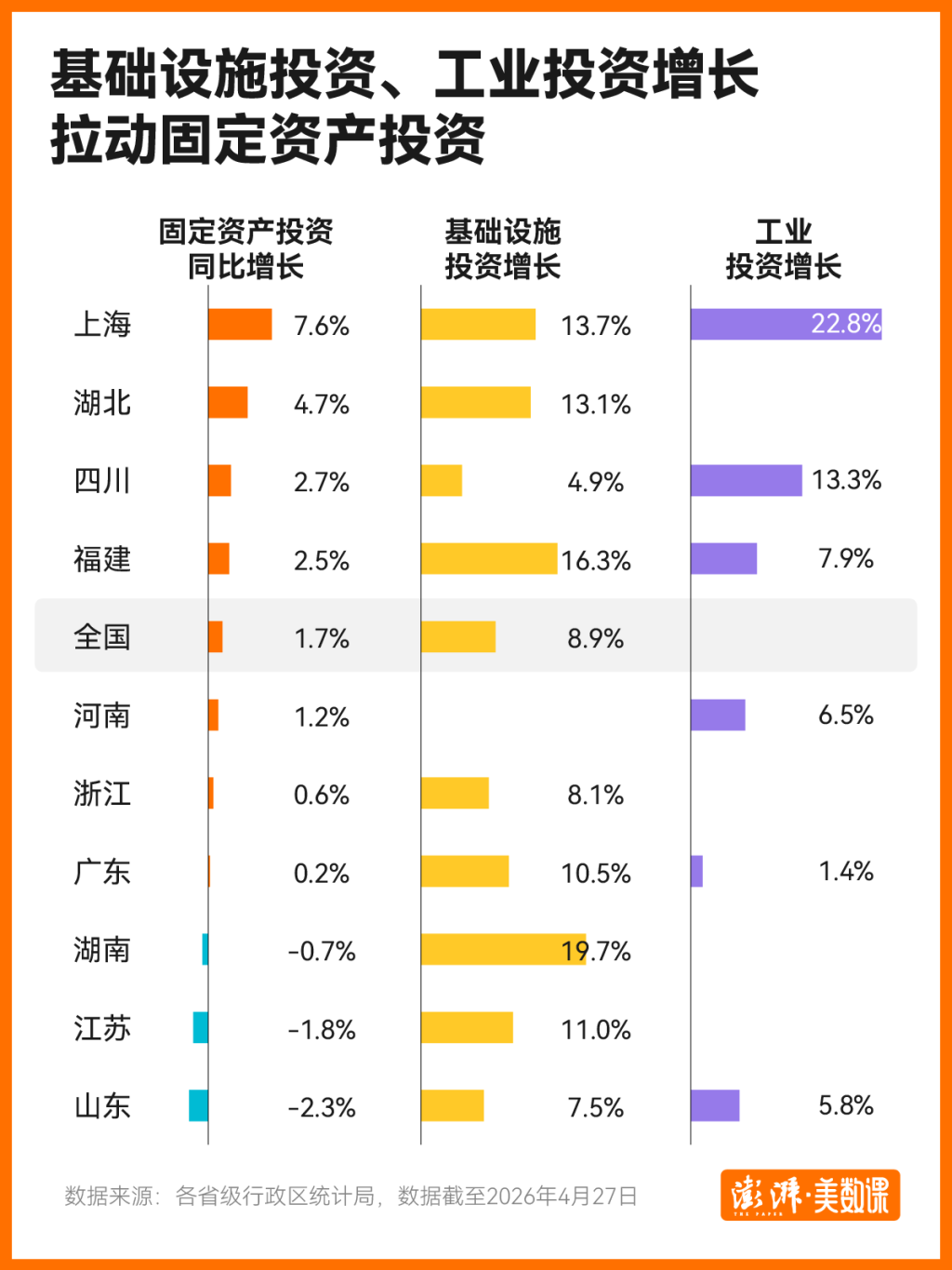 上海、湖北、四川、福建的固定資產(chǎn)投資增速高于全國。分領(lǐng)域看,經(jīng)濟大省的工業(yè)投資和基礎(chǔ)設(shè)施投資增速普遍較高,不少省份達兩位數(shù)。以上海為例,一季度工業(yè)投資增長22.8%,城市基礎(chǔ)設(shè)施投資增長13.7%;湖北基礎(chǔ)設(shè)施投資增長13.1%;湖南基礎(chǔ)設(shè)施投資增長19.7%。