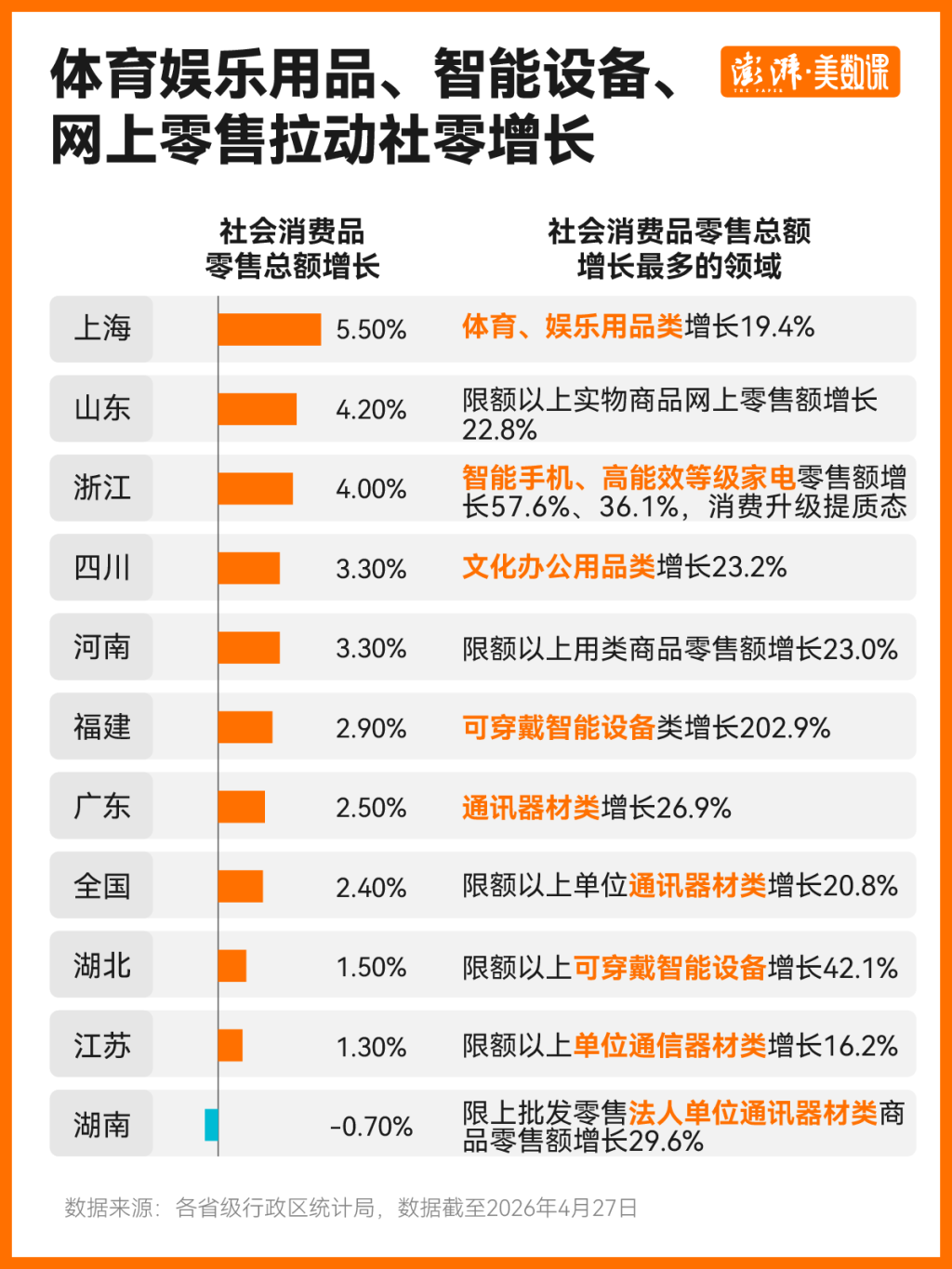 從經(jīng)濟大省數(shù)據(jù)看,消費增長動力主要來自體育娛樂用品、智能設(shè)備和網(wǎng)上零售。例如,上海體育娛樂用品類零售額增長19.4%;浙江智能手機、高能效家電零售額分別增長57.6%和36.1%;福建可穿戴智能設(shè)備零售額增長202.9%。