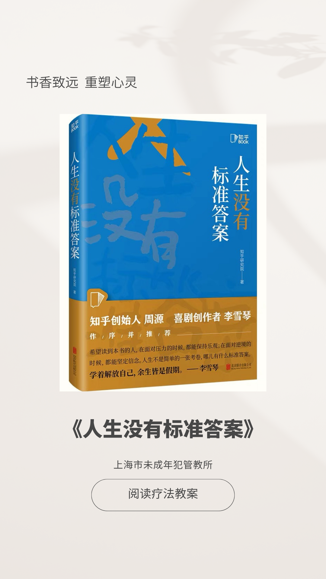在精準薦書基礎上,深化“一書一教案、一人一方案”機制。結合書籍內(nèi)核、適宜罪犯類型、引導方向編撰導學教案,明確閱讀目標、引導重點、對話要點與矯治方向,實現(xiàn)精準化運行。