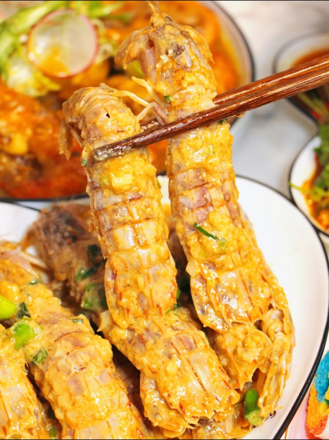 咸香流油的咸蛋黃和鮮美的蝦姑是絕配。先把蝦姑炸定型,再把炒到起沙的咸蛋黃裹在上面,每一口都讓人滿足。