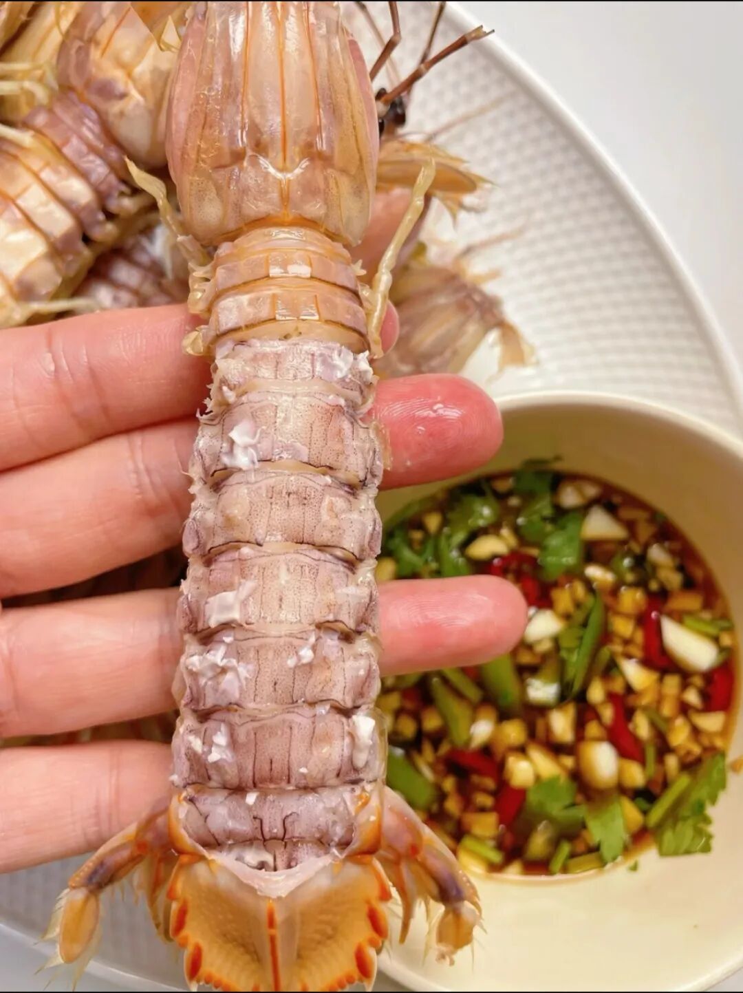 最能品嘗蝦姑原味的做法。水開后上鍋,蒸5-8分鐘,看到蝦身變紅卷曲就熟了。搭配簡單的姜醋汁,鮮甜原汁原味,特別適合吃母蝦的蝦膏。