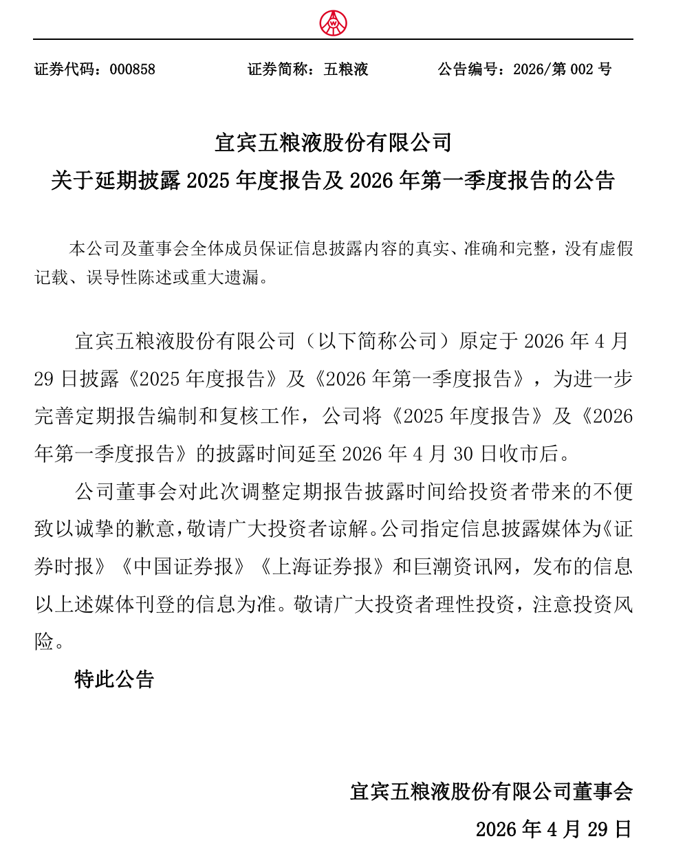4月28日深夜,白酒龍頭五糧液對外發(fā)布公告,原本計劃在4月29日披露的2025年年度報告以及2026年第一季度報告,因為需要額外時間進一步優(yōu)化定期報告的編制與復核流程,現(xiàn)在正式延期到2026年4月30日收盤之后對外披露。
