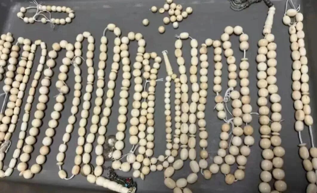 廣州白云機(jī)場海關(guān)的工作人員在監(jiān)管進(jìn)境航班的時(shí)候,發(fā)現(xiàn)一名旅客的行李過機(jī)圖像存在異常,圖像里顯示有大量密度不對的小球形物品。打開箱子查驗(yàn)之后,發(fā)現(xiàn)里面竟然藏了31件象牙制品,包含項(xiàng)鏈、珠串、散珠等,總重量一共有843克,經(jīng)過鑒定全部都是現(xiàn)代象牙制品。