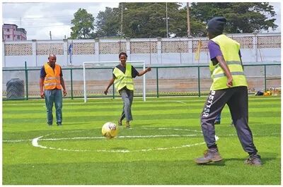 肯尼亞內(nèi)羅畢河流域生態(tài)修復(fù)項目配套修建了足球場,為當(dāng)?shù)鼐用裉峁┝诵蓍e健身場地。人民日報記者 黃煒鑫攝