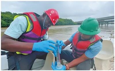 當(dāng)?shù)貑T工在圭亞那新德梅拉拉河大橋旁開展水質(zhì)抽樣檢測。人民日報拉美中心分社 維娜·甘加丁攝