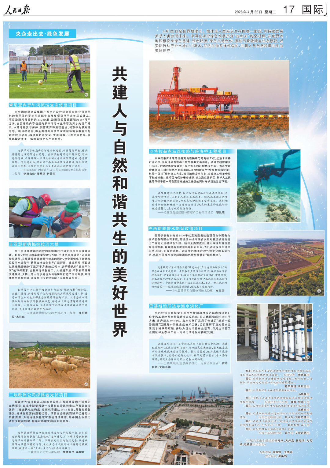 地球是全人類賴以生存的唯一家園,可持續(xù)發(fā)展關(guān)系著全人類的共同未來。不久前,《人民日報》用整版篇幅刊發(fā)了《共建人與自然和諧共生的美好世界(央企走出去·綠色發(fā)展)》一文,講述了多家中央企業(yè)走出國門,在全球各地參與綠色基建、綠色能源、綠色交通項目合作,推進節(jié)能降碳和生態(tài)修復(fù),與世界各國共同建設(shè)人與自然和諧共生的美好家園的實踐故事。現(xiàn)在小新就為你全文分享這篇內(nèi)容——