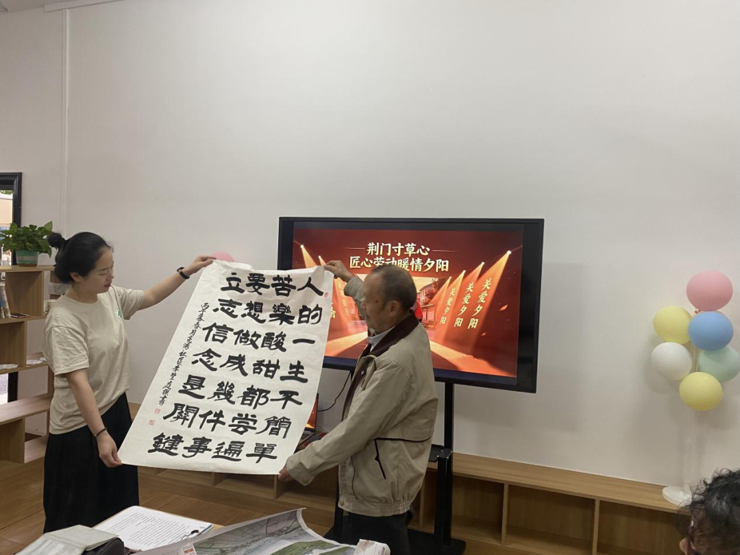本次活動圍繞社區(qū)老年群體的實際需求設(shè)計,精心安排了勞動榜樣分享、創(chuàng)意匠心手作、便民惠民服務(wù)、防詐騙知識宣傳等多個環(huán)節(jié),讓參與活動的社區(qū)居民在親身參與中感受勞動創(chuàng)造的美好,在互動交流中收獲鄰里之間的溫情,讓寶貴的勞動精神在服務(wù)與陪伴中不斷傳遞延續(xù)?;顒訉iT邀請了社區(qū)本地的勞動榜樣李豐庭,他結(jié)合自己幾十年的工作經(jīng)歷,給在場群眾講述了老一輩工作者扎根崗位的堅守與擔(dān)當(dāng)、默默付出的汗水與獲得的榮譽,內(nèi)容真摯動人,讓在場所有人都深受觸動,也讓勞動精神在代代相傳中綻放出新的光彩?;顒蝇F(xiàn)場,李豐庭和居民李存平還展示了兩幅專門為本次活動主題創(chuàng)作的書法作品,筆墨之間藏著對勞動的感悟、對活動的祝福,濃郁的文化氛圍為本次活動增色不少。