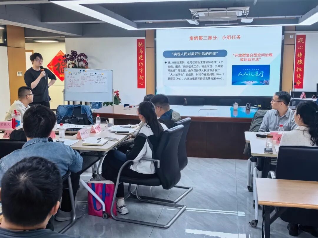 市委黨校的老師為大家講解了楊浦區(qū)228街坊改造項目完成「蝶變」的更新案例,項目通過「征收與保留兼顧」的實踐路徑,讓原本的工人新村舊址轉(zhuǎn)型成為集合社區(qū)服務(wù)、文化展示、創(chuàng)業(yè)孵化功能于一體的復(fù)合型公共空間。培訓(xùn)環(huán)節(jié)還設(shè)置了小組討論與匯報展示,激發(fā)青年針對公共空間運營難題、基層治理現(xiàn)代化方向展開思考,有效鍛煉了青年的創(chuàng)新思維與問題破解能力。