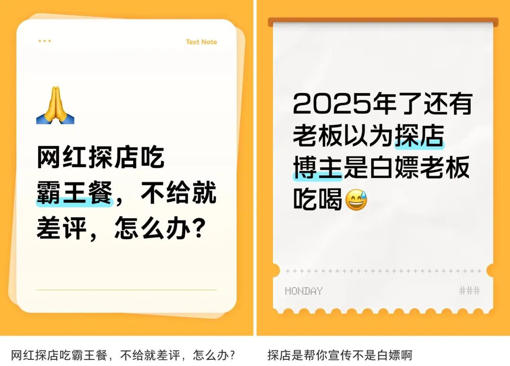 更夸張的是,還有一些不請(qǐng)自來(lái)的博主,會(huì)自己帶著寫好字的告示去探店,不管店家同不同意,拍了照直接貼上去,拍完照發(fā)小紅書、點(diǎn)評(píng)就能引流,流量賺到了再說(shuō)。