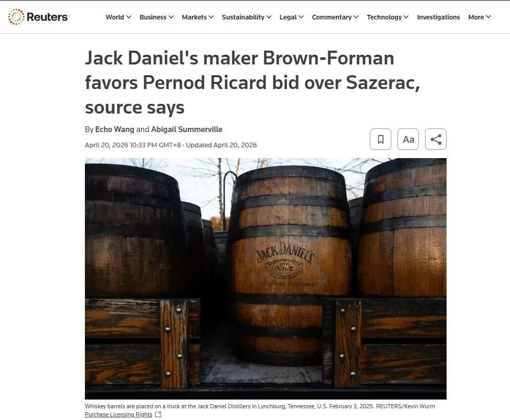 業(yè)內(nèi)普遍分析,這次談判終止的一個重要誘因,是此前美國烈酒巨頭薩澤拉克突然宣布,將以150億美元全現(xiàn)金的方案主動收購百富門,這一出價直接抬高了保樂力加與百富門的談判籌碼,讓原本的磋商陷入僵局。