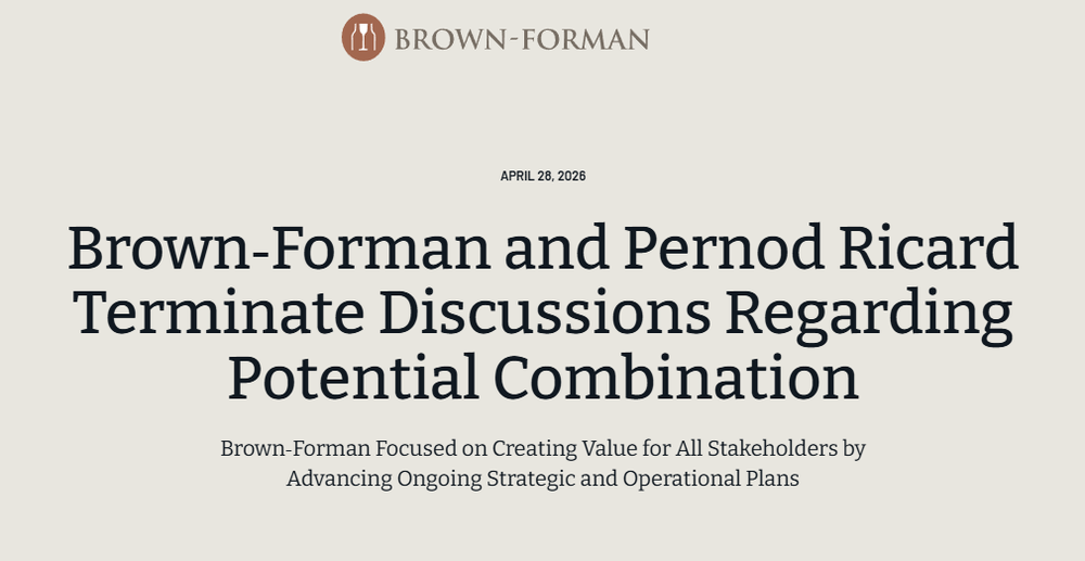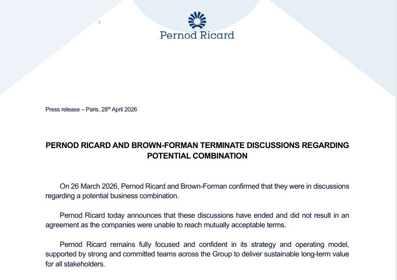 就在剛剛,全球知名烈酒集團(tuán)保樂力加與美國酒業(yè)品牌百富門同步發(fā)布官方公告,正式宣布停止雙方從3月底啟動、一度引發(fā)全球酒業(yè)高度關(guān)注的合并磋商。這場曾被業(yè)內(nèi)預(yù)測會改寫全球烈酒產(chǎn)業(yè)格局的“對等合并”計劃,在推進(jìn)了將近一個月后,最終宣告終止。